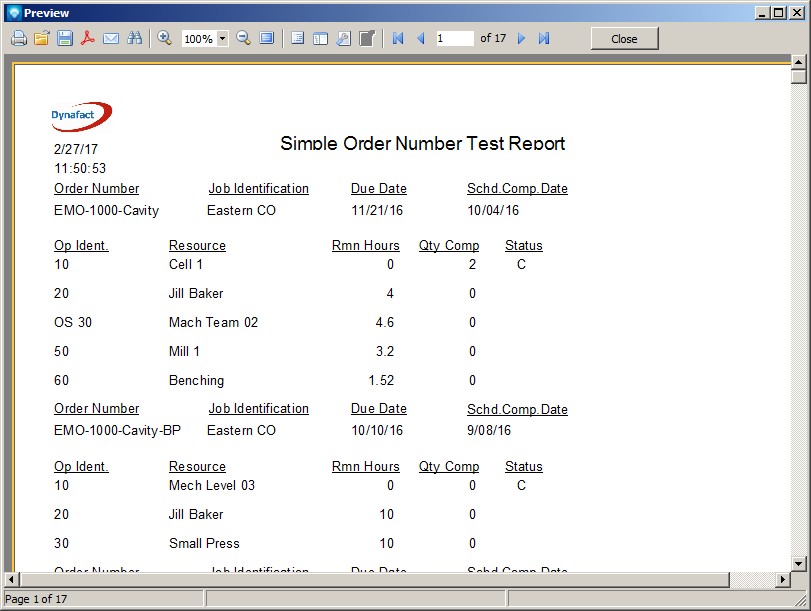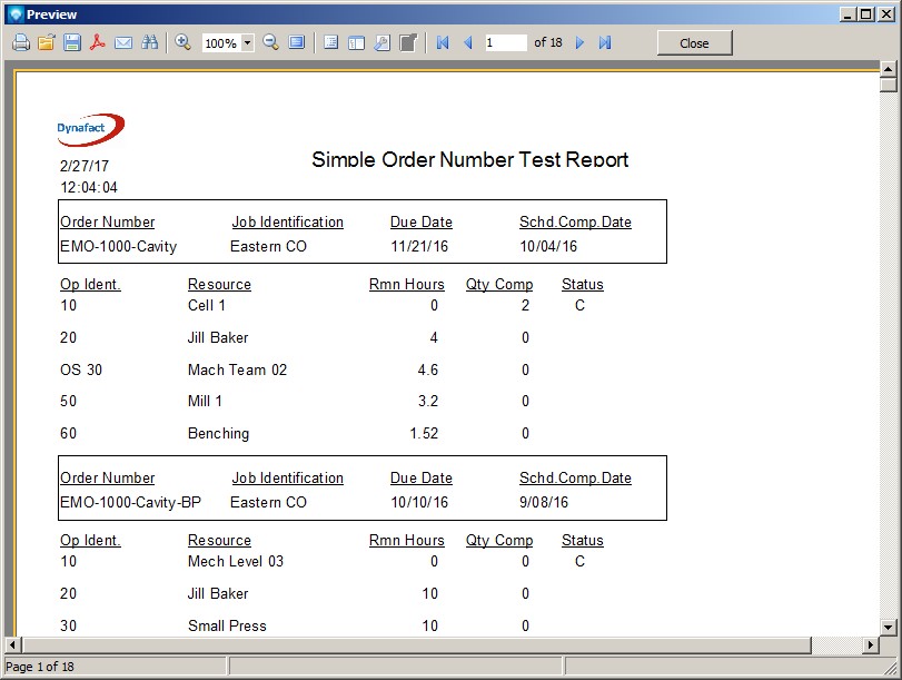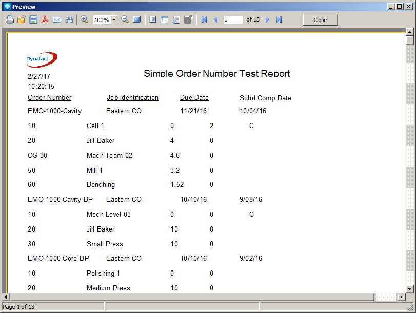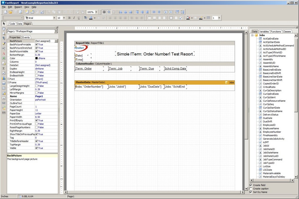 In this tutorial, we are going to edit the report created in the Report on Jobs Tutorial. From Mfg Orders Job grid, select the report and click on the Edit Report button. On the next window, select the Customize Report button and your report will appear in the DMS Report Designer similar to the example below: