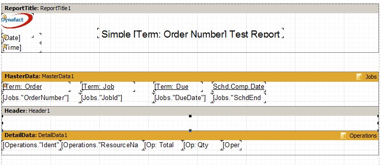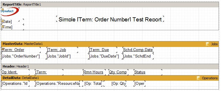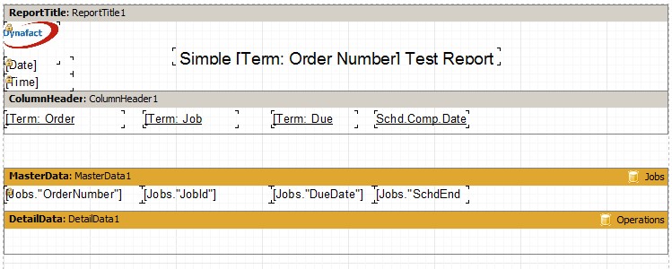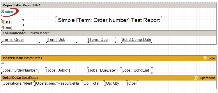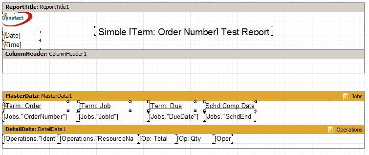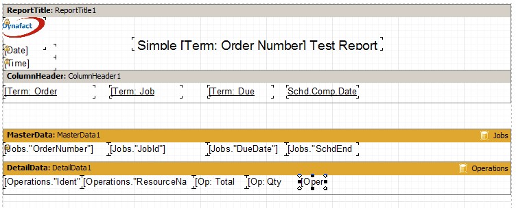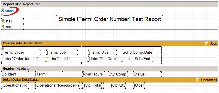 The first step is to make room on the Master Data Band for the new text headings. Click on the Master Data Band and resize the band height and make it larger. Then, click on the first data field, Jobs OrderNumber, and while holding down the Shift key, click on the other job fields DueDate, and SchdEndDate. Release the Shift key, and press and hold the Ctrl key. Using the cursor arrows, press the down arrow to move all the fields down in the Master Data Band. Your design area will be similar to: