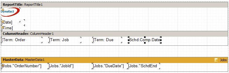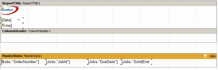 We are going to add the following job data fields from the Data tab located on the right side of the windows. You can do this by clicking on the Jobs data field and dragging it to the report design area. After you drop the data field onto the report, you can change the size of the data field by grabbing the black squares of the data field with the mouse and resize the field. For example, the JobId field below shows the black squares where you can grab and resize the field:
