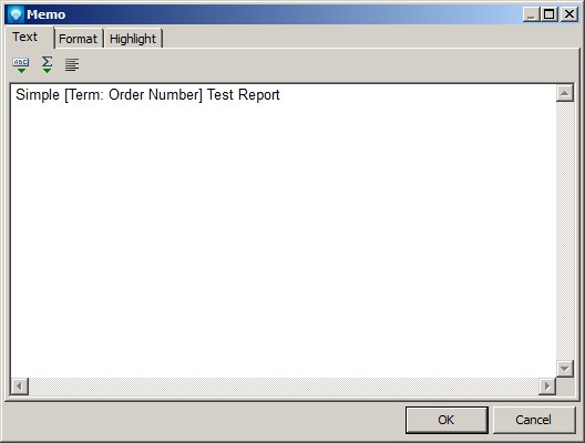 located on the vertical Designer Menu Bar, and draw a text box object on the Report Title Band. The text box pop up will appear. We want the title to be "Simple Order Number Test Report", but we want the order number to be the DMS Term Order Number. To create this report title, enter "Simple " to the memo. Then press the icon at the top left side of the pop up