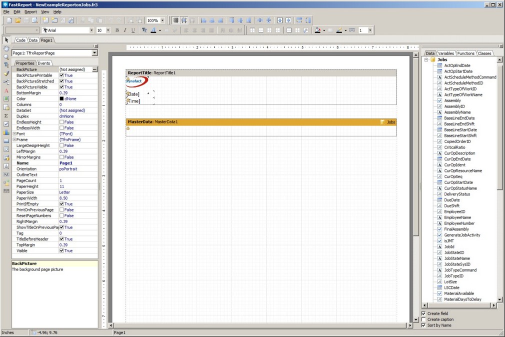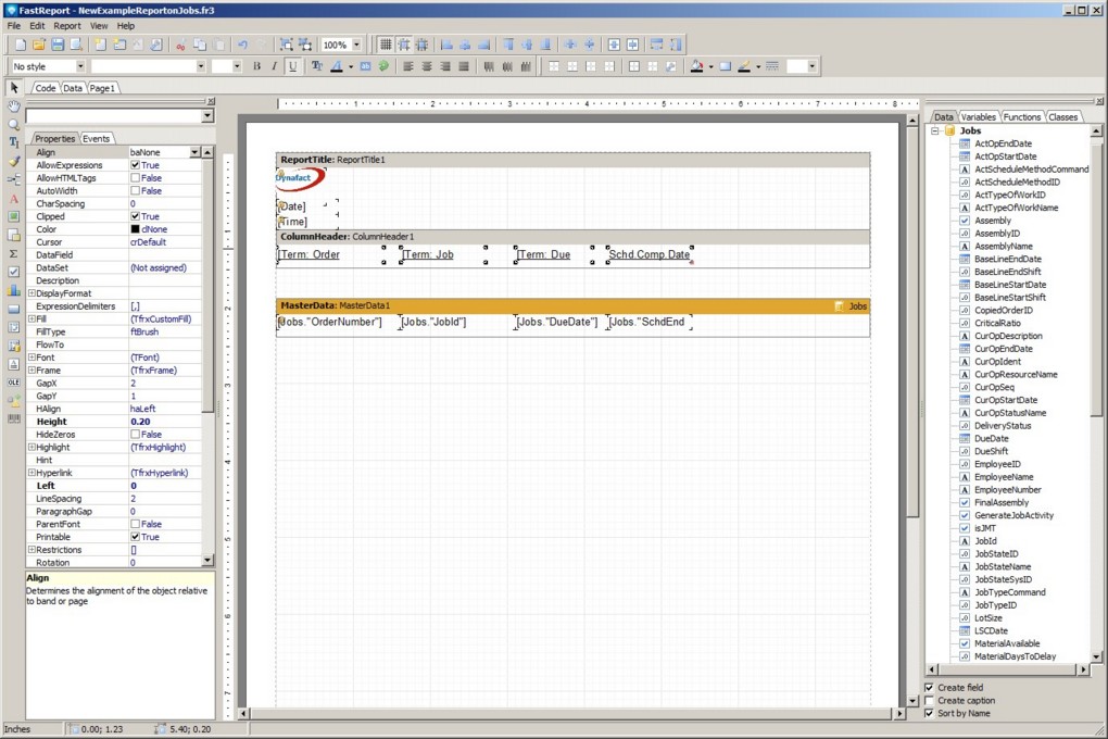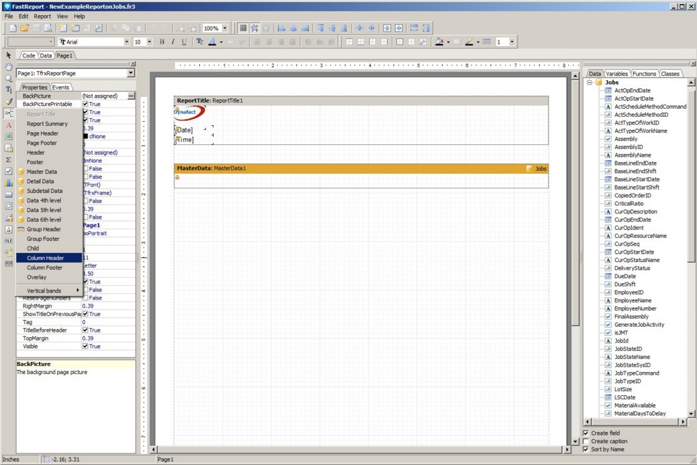 Drag the following job fields onto the Master Data Band and change the width of each field after you drop it as required: