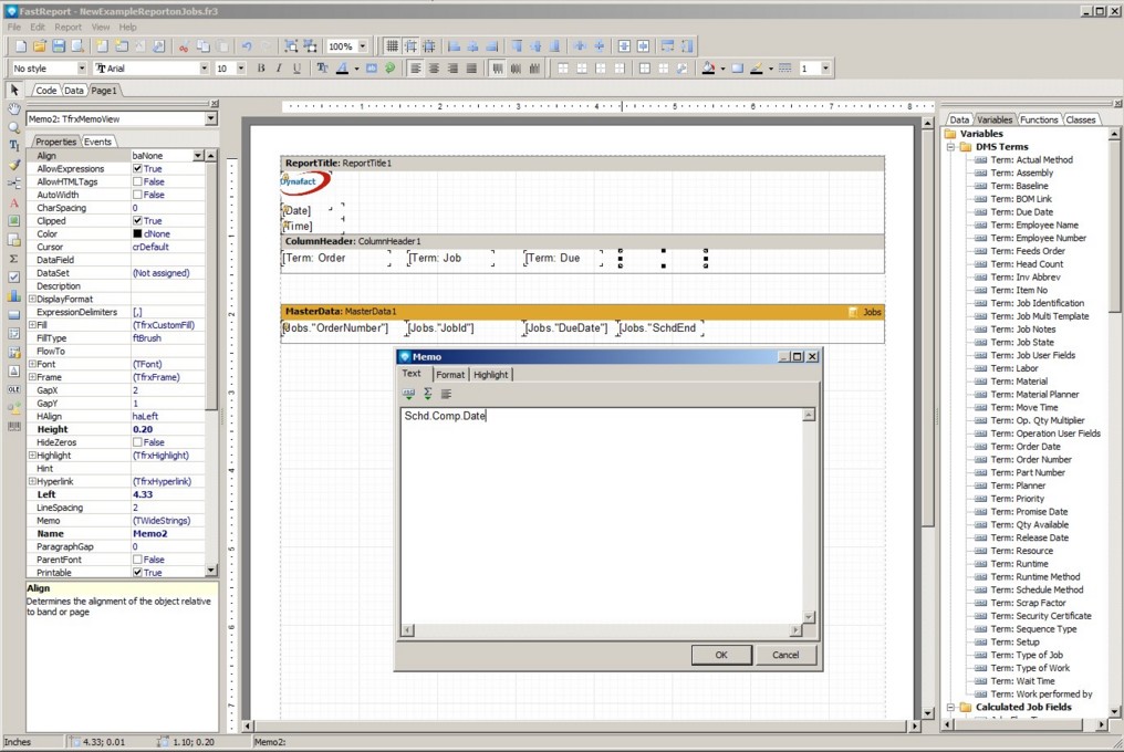 Click the Save button and the DMS Report Designer appears with information inherited from the Job Base report: