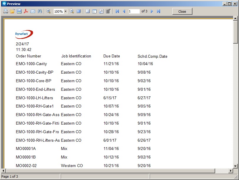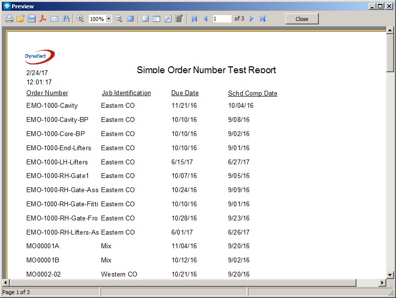 or by File | Save. Exit the report using File | Exit. You will be returned to the Mfg Orders Job Grid. Trying viewing your new report by using the View Report button. Your report will appear something similar to the example below. Note that while you are in the Report Designer you can press the F9 key to run the report. However, the report generated will not have any search filters and the report may take some time to complete. You can always cancel the report by clicking the Cancel button on the report preview window which appears at the top right side of the window: