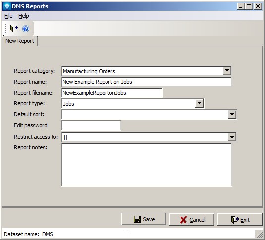 DMS will display the New Report window. Enter the information as per the example below (you can use the default Report filename):