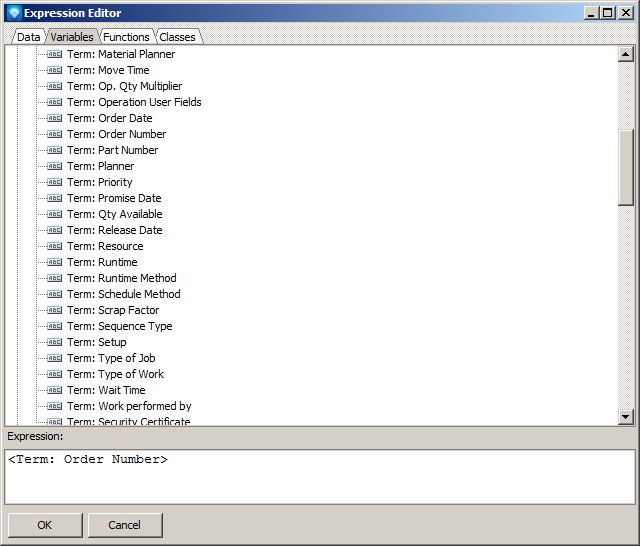 . A new window will appear called the Expression Editor. Click on the Variable tab and then double click the DMS term Order Number. The Expression Editor will appear as in the following example: