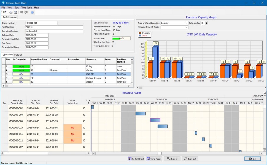 The Resource Gantt Chart displays the dispatch list for each resource from the current schedule start date out a given number of days. The job/operation highlighted in the resource Gantt is automatically displayed on the job panel at the top left and in the operation grid below the job panel. The operation highlighted in the Operation Grid has its resource capacity displayed at the top right.