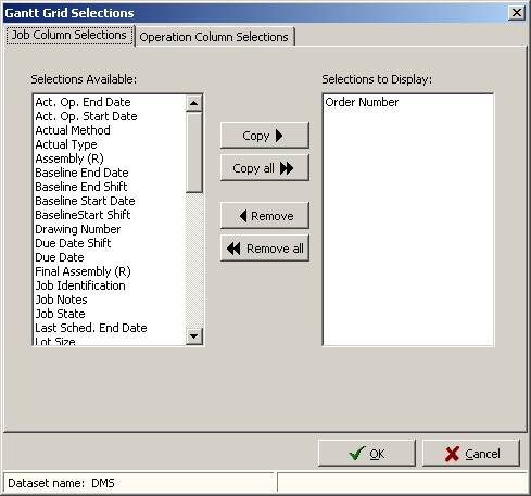 The following settings can be selected for the Resource Gantt graph column display. There are two tabs; one for job selections which appear first and one for operation selections. The example below shows the Job tab: