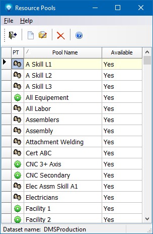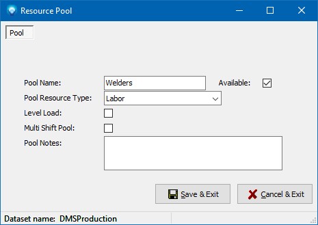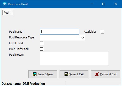 A resource pool is a group of resources that have the ability to perform a common task(s). You can group one or more resources under a pool for scheduling purposes, capacity analysis purposes, and/or for reporting purposes. Before a resource can be grouped into a resource pool, the resource pool must be defined. Once a resource pool has been defined and is used by DMS, it cannot be deleted unless resources using the resource pool are assigned to another resource pool. Instead of deleting a resource pool you can make it unavailable for use by unselecting the Available check box.
