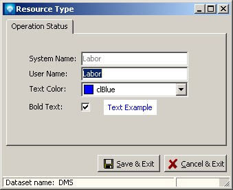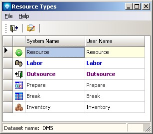 To access Resource Types, select Table | Resource Types. The following screen will appear listing the resource types:
