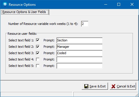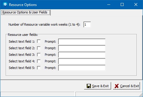 To setup resource user fields select Table | Resource User Field Options from the main menu. The following windows will appear: