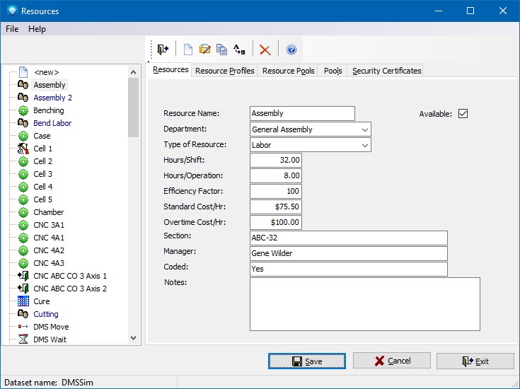 If resource user fields have been setup, they will appear automatically on the resource form. In the example below, three user fields Section, Manager and Coded appear on the window above the Notes: