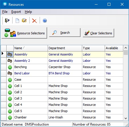 Resources must be defined before they are used by jobs' operations. To access Resources, select Manufacturing | Resources from the Manufacturing Menu.