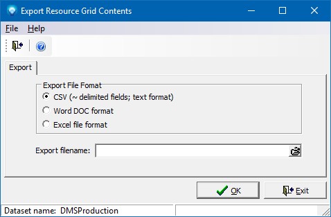 You can export the grid to a CSV file, Word DOC file or an Excel file format. Select the file format, enter the filename to export to, and press the OK button to export the Resource Grid.