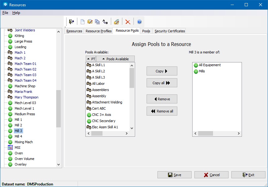 For the selected resource in the resource tree, the pools available are listed as well as the pools that the resource is already a member of. In the example below, the selected resource in the Resource Tree is "Mill 3" and it is a member of two pools; "All Equipment" and "Mills" as shown in the Mill 3 is a member of list box. Other pools defined in DMS that "Mill 3" is not a member of are listed in the Pools Available list box.