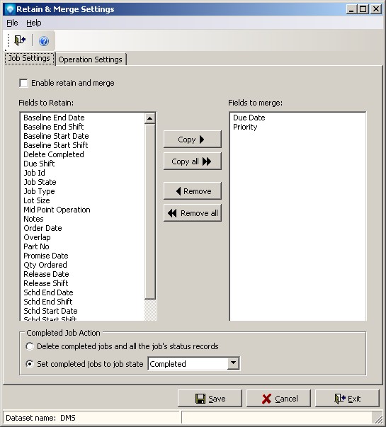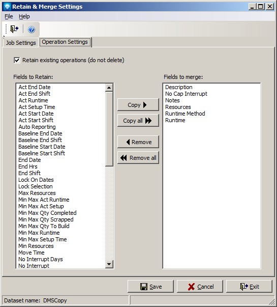 The prompt "Retain existing operations" means that if the job being imported does not have those operations that currently exist for the job in DMS, then do not delete the current operations from the existing job. If you uncheck this prompt, then imported jobs that do not have operations that match the existing job's operations will have the unmatched operations in the existing job deleted. If you wanted to completely replace a job’s routing, you need to copy all retain and merge operation values to the list box “Fields to merge” and uncheck “Retain existing operations”. All operations being imported would then replace the current operations.
