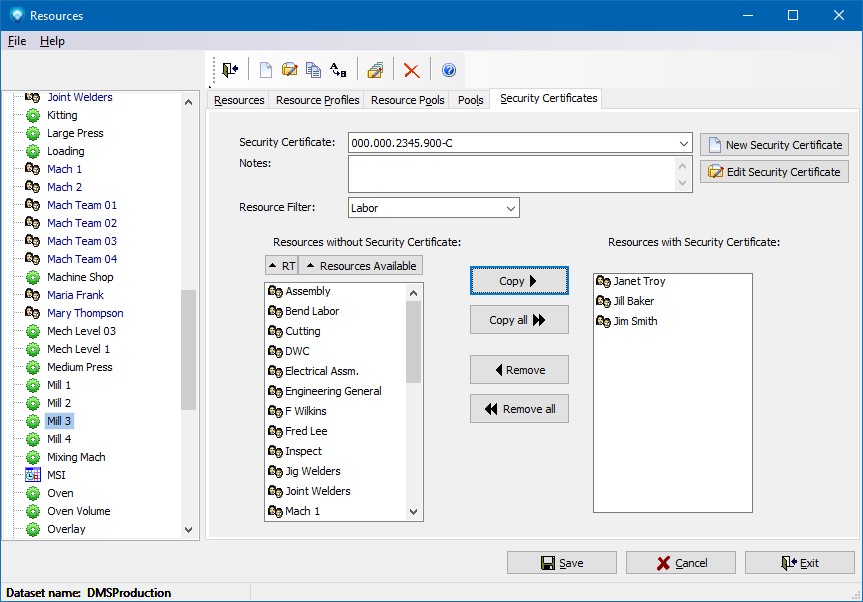 The example below shows job identification 000.000.2345.900-C has been defined as a security certificate. A filter of Labor was used so that only labor resources are displayed in the Resources without Security Certificate. There are three resources that have been approved to work on the jobs and they are listed in the selection box Resources with Security Certificate: