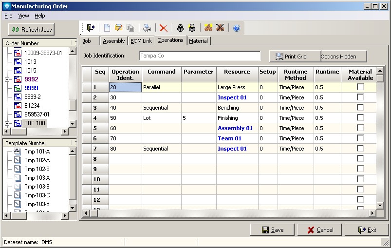 The sequence type is used to structure how you want the operations to flow material in your job. It establishes the flow rules that the DMS Scheduling Engine can follow. Sequence types are given at the job level and may be changed at the operation level.