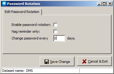 Set Password Rotation enables you to setup a time limit in days after which DMS will force or nag users to change their password each time the user logs into DMS. To set the password rotation policies, you must have Security Access as set in User Passwords. To setup a password rotation policy, select Security | Set Password Rotation from the main menu. The following window will appear: