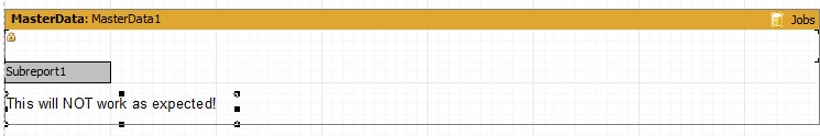 When working with sub reports it is important to not place objects below the sub report without using a Child Band. If you do not use a child band for objects below a sub report, the objects created in the sub report will overlay everything placed below the sub report object on the main design page. This example below will not work as expected:
