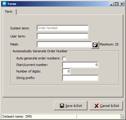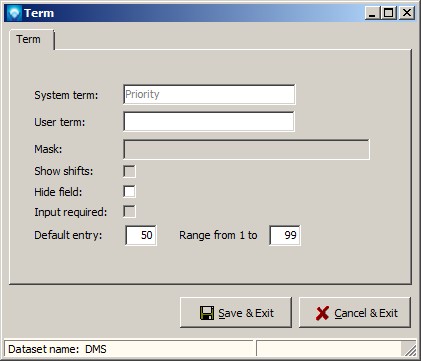 - User term You have the option of entering your own term that will replace the system term in DMS. If you leave this field blank, the system term will be used. Anything else that is entered becomes the new term that is used throughout DMS.