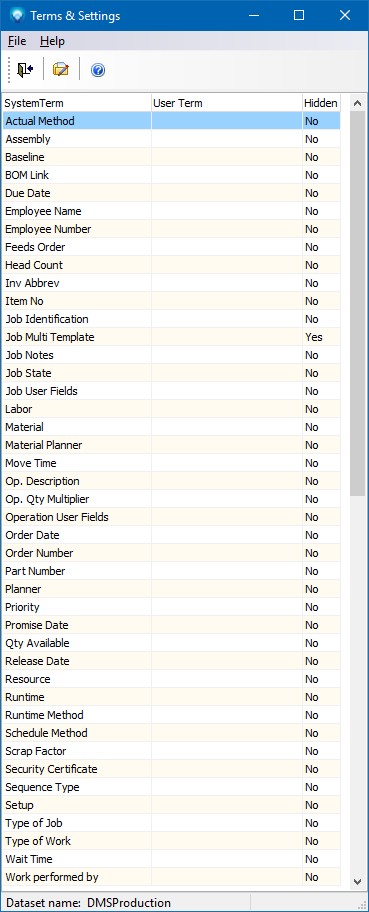 To access Terms and Settings, select Tables | Terms & Settings. The terms and settings screen will appear listing all the system terms, the user terms (if there are any), and where or not the field is hidden. The example below shows the Term and Settings screen expanded to show the complete list of terms: