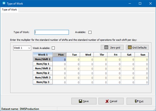 The Type of Work enables you to define the standard number of shifts per day for each variable work week (up to 4 weeks). Note that the number of work weeks is defined by Tables | Resource Options & User Fields.