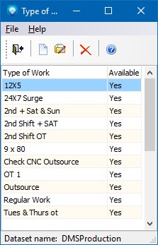 The Regular Work type of work profile is automatically created when a new dataset is created. Regular Work cannot be deleted and cannot be made unavailable in order to always be available within DMS for Resource Profiles to use. You can, however, change the Regular Work name to whatever name you wish to use (i.e. "5 x 1" for days days a week 1 shift, or "Standard Week", etc.). You can also change the default shift and days of the week settings to whatever is required for your scheduling purposes.