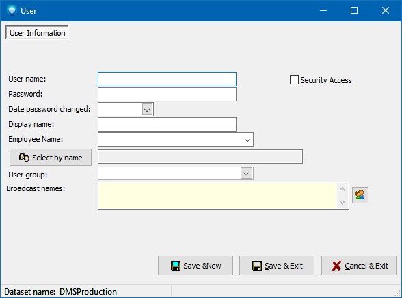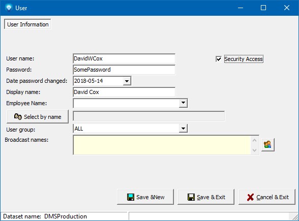 When you are finished you can click on the Save & New button to save the current user and start adding another new user, or you can click Save & Exit to save the user and return to User list screen.  If you click Cancel & Exit, the data you have entered is ignored and the user is not saved.