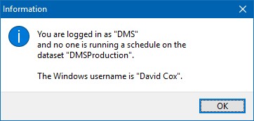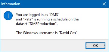 A pop up window will appear similar to the example below telling you the user name logged on to this workstation and, if a schedule is being run, the name of the user running the schedule. In the example below, the workstation is currently logged on as "DMS" and "Pete" is running a schedule on "DMSProduction". The popup also identifies the Windows' user name as "David Cox".