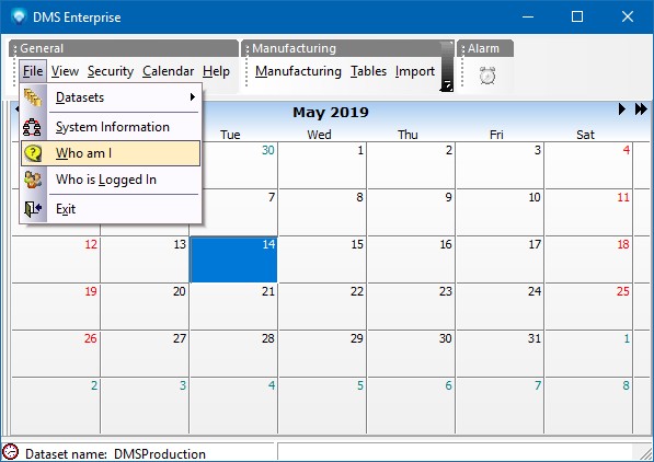 in the bottom left corner which indicates that a schedule is currently being run on the "DMS" dataset. To find out who is running a schedule, you can use the File | Who am I from the calendar's General menu as in: