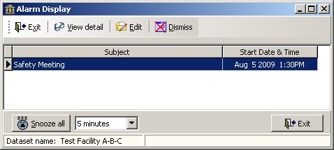 The Alarm Display is a pop up window that appears on the calendar reminding you about a calendar activity. The Alarm Display will also appear if you click on the Alarm icon