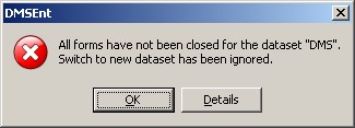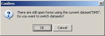 If you have open forms in the current dataset and you select a new dataset, DMS will warn you with the following message: