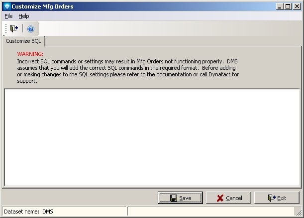 The Customize Mfg Orders module enables advanced SQL users to make modifications to the SQL query in Manufacturing Orders Job Grid.  This feature should only be used to attach data from a user created table from within the DMS database to a job.  It must not be used to try and customize the SQL query as unpredictable results can occur.