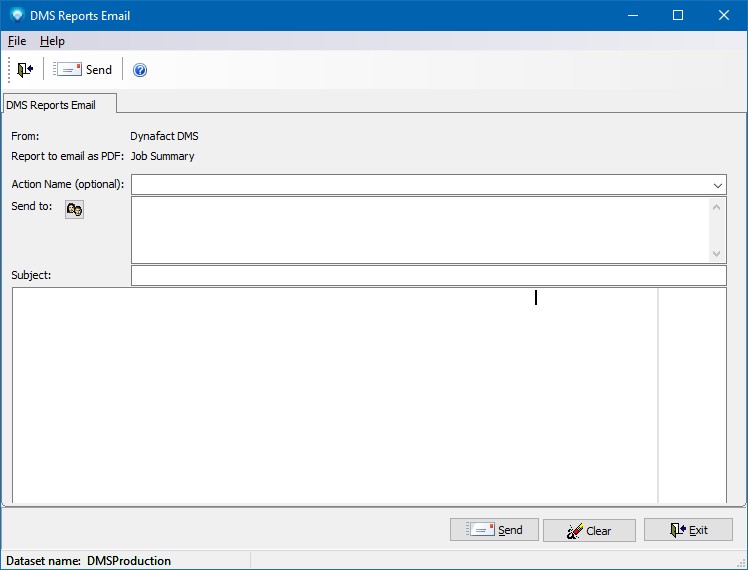 in the DMS Reports Preview window will display the DMS Reports Email window as shown in the example below. The email address that will be sending the report and the name of the report are displayed at the top left side of the window. In the example below, the email will be sent by "Dynafact DMS" and the report to email as a PDF is "Job Summary":