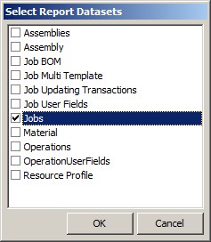 Before you can add DMS data to a data band, you should select what DMS datasets (tables) you want on your report. To select the DMS Datasets, from the DMS Report designer select Report | Data. A menu listing the datasets available for the report appears. The list of datasets depends on the report's DMS Report type. The example below shows the datasets available for a Jobs report type: