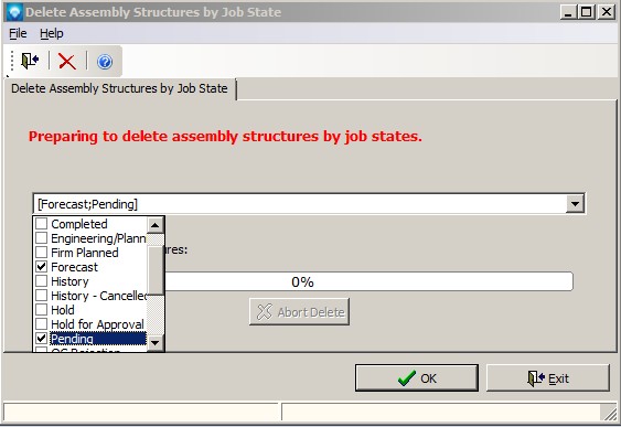 The Delete Assembly Structures by Job State can also be executed in a batch or command file. See Auto Delete Assembly Structures by Job State for more information.