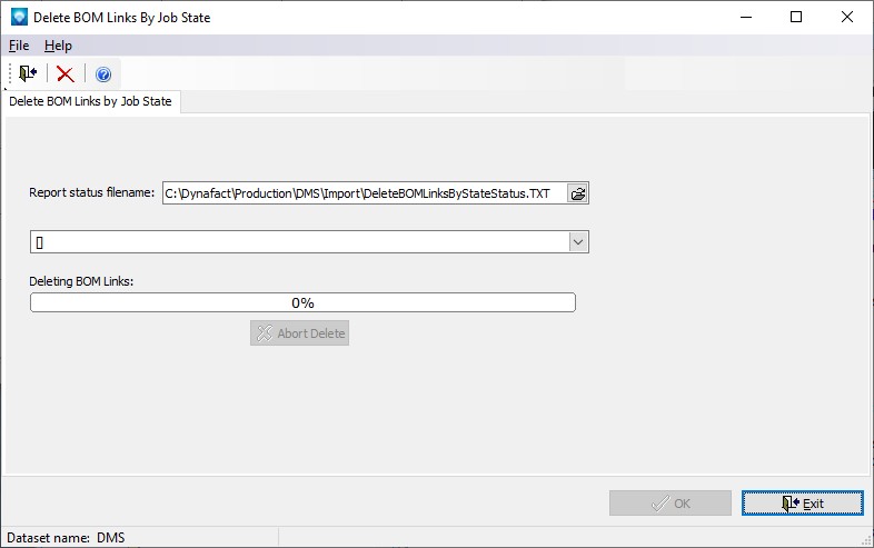 This command can be used to delete BOM Links by job state from DMS so that new BOM Links can be imported via a SQL script or a text file. Note that once a BOM Link is deleted, it cannot be recovered. Also not that jobs that make up a BOM Link are NOT deleted; just the BOM Links (i.e. the relationship between jobs) is deleted.