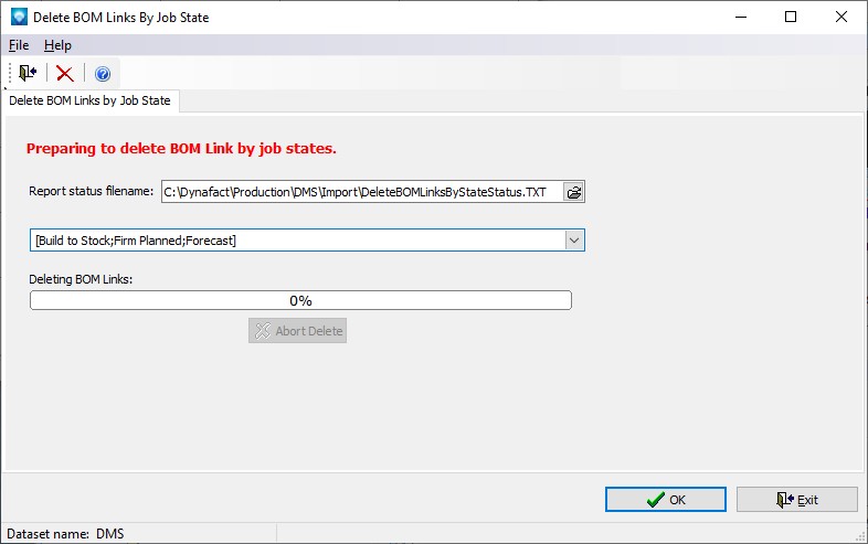 The Delete BOM Links by Job State enables you to delete all BOM Links by one or more job states. The command is executed from the main menu using File | Dataset | Delete BOM Links by Job State. To execute this command the user’s group must have access to “Clear Selected Tables” in the User Groups settings.