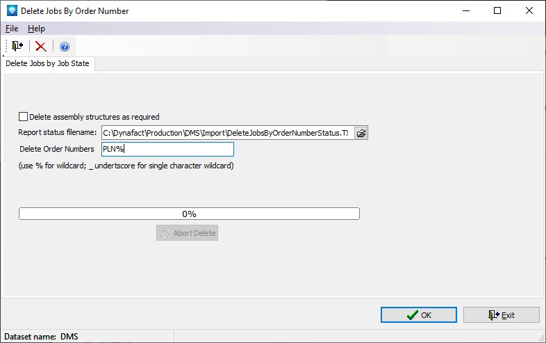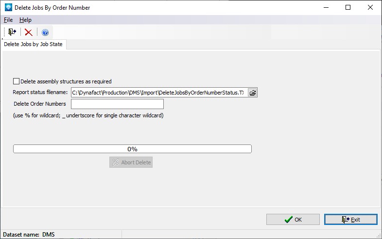 The Delete Jobs by Order Number enables you to delete one or more jobs by a given order number using wildcards. The command is executed from the main menu using File | Dataset | Delete Jobs by Order Number. To execute this command the user’s group must have access to “Clear Selected Tables” in the User Groups settings.