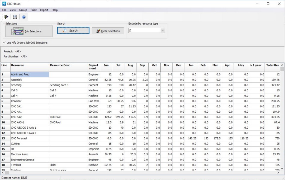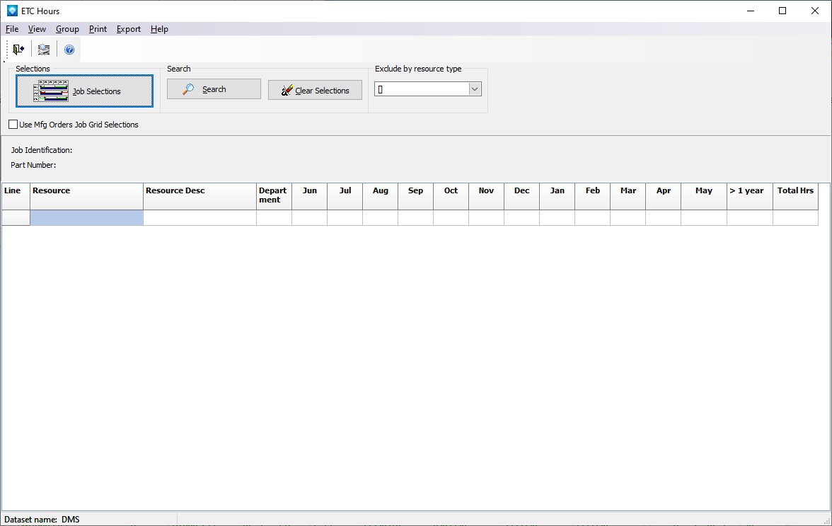 The ETC Hours Display (Estimate to Complete) shows the work assign to resources, pools, or departments from the current schedule start date out 12 months. When the ETC Hours Display appears, information is not displayed until the Search button is pressed. The display can be dependent of the selections made in Manufacturing Orders Job Grid if the Use Mfg Orders Job Grid Selections is checked, or selections can be made using the Job Selections button.