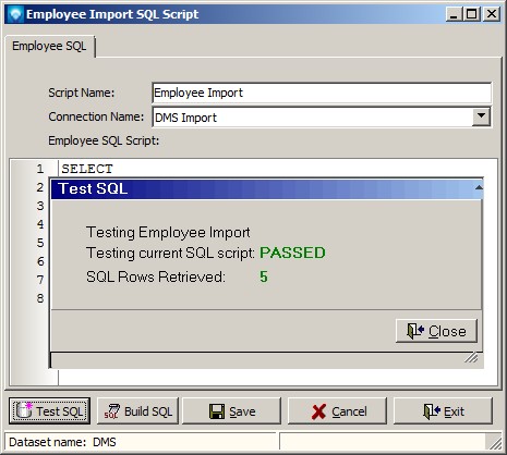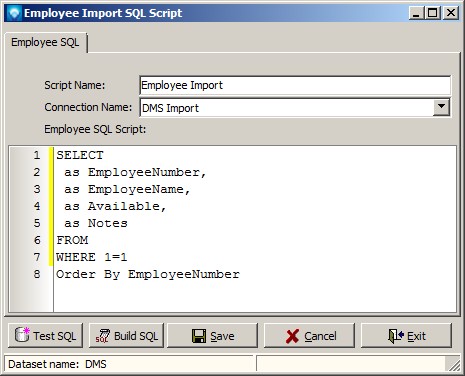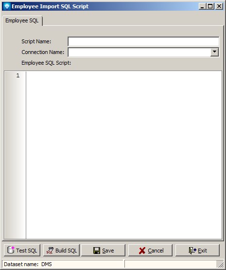 The Employee Import SQL Scripts are where you define the SQL to import employee information into DMS from an external database. Before you add the SQL scripts, one or more connection strings must be defined. Any number of SQL scripts can be defined. For help writing SQL scripts in DMS, please see Hints and Tips Writing SQL Scripts. For details on the SQL columns required for the import, please see SQL Employee Columns Required.