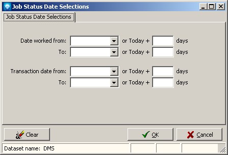 Date Selections enables you to search for job status transactions whose dates are in a given date range. To access date selections, click on the Date Selections button: