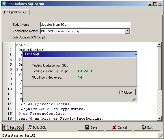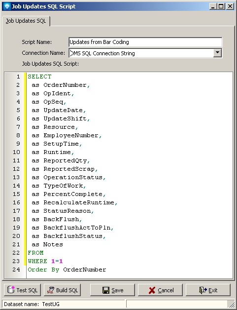 The Job Updates SQL Scripts are where you define the SQL to import job updates from an external database into DMS. Before you add the SQL scripts, one or more connection strings must be defined. Any number of SQL scripts can be defined. For help writing SQL scripts in DMS, please see Hints and Tips Writing SQL Scripts. For details on the SQL columns required for the import, please see SQL Job Updates Columns Required.