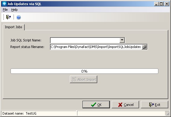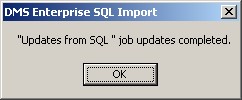 The Job Updates via SQL will run a predefined script on an external database and add job updates to existing jobs in DMS. Select Import | Import via SQL | Job Updates via SQL to execute the import.