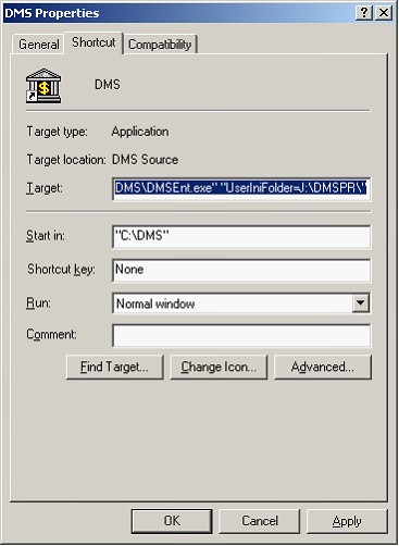 The screen example below shows the properties of the DMS shortcut icon on the desktop. The target has been changed to execute the DMSEnt.EXE from the folder C:\DMS\ as specified by the “C:\DMS\DMSEnt.EXE” parameter. The DMSUser.INI file is located in the UserIniFolder J:\DMSPr\. This is specified be the parameter “UserIniFolder =J:\DMSPr\”. Note that both the executable file location and the UserIniFolder parameter have been surrounded by double quotes. The entire target line is "C:\DMS\DMSEnt.exe" "UserIniFolder=J:\DMSPR\".