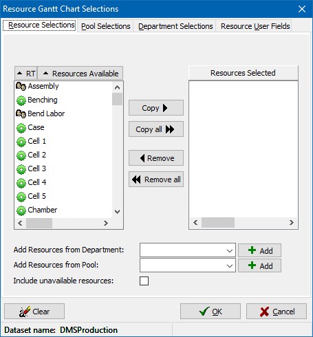 When you first enter into the Resource Gantt, the resource selections window is displayed asking you the resources you want to graph. You can also select the resource to graph by using either File | Resource Selections or View | Resource Selections.