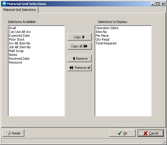 The following settings can be selected for the Resource Gantt Material Grid display: