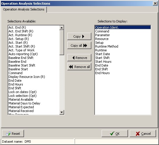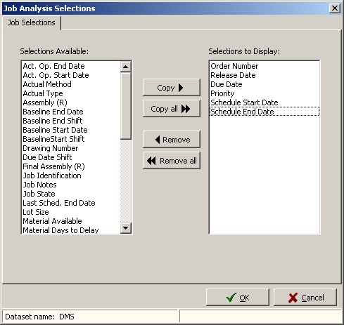 The following settings can be selected for the Resource Gantt graph column display. There are two tabs; one for job selections which appear first and one for operation selections. The example below shows the Job tab: