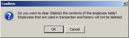 Select OK to clear the table, or select Cancel to ignore the clear. If OK is selected, all employees who are not used by a transactions or jobs will be deleted.