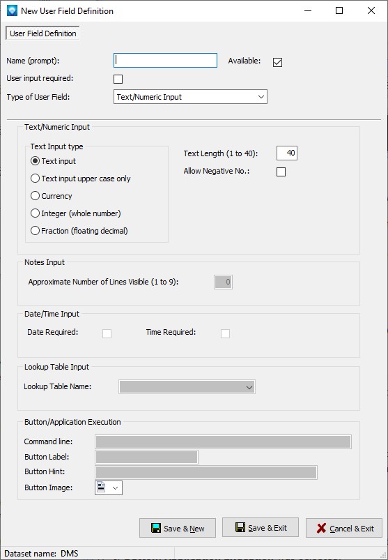 User Field Definitions is where you define each user field you would like to use. You define the name of the user field and it attributes, such as the type of user field (Text, Notes, Date/time, etc.). After you have defined a user field, you select where you want to use the user field and how it will appear on the screen using User Fields Required.